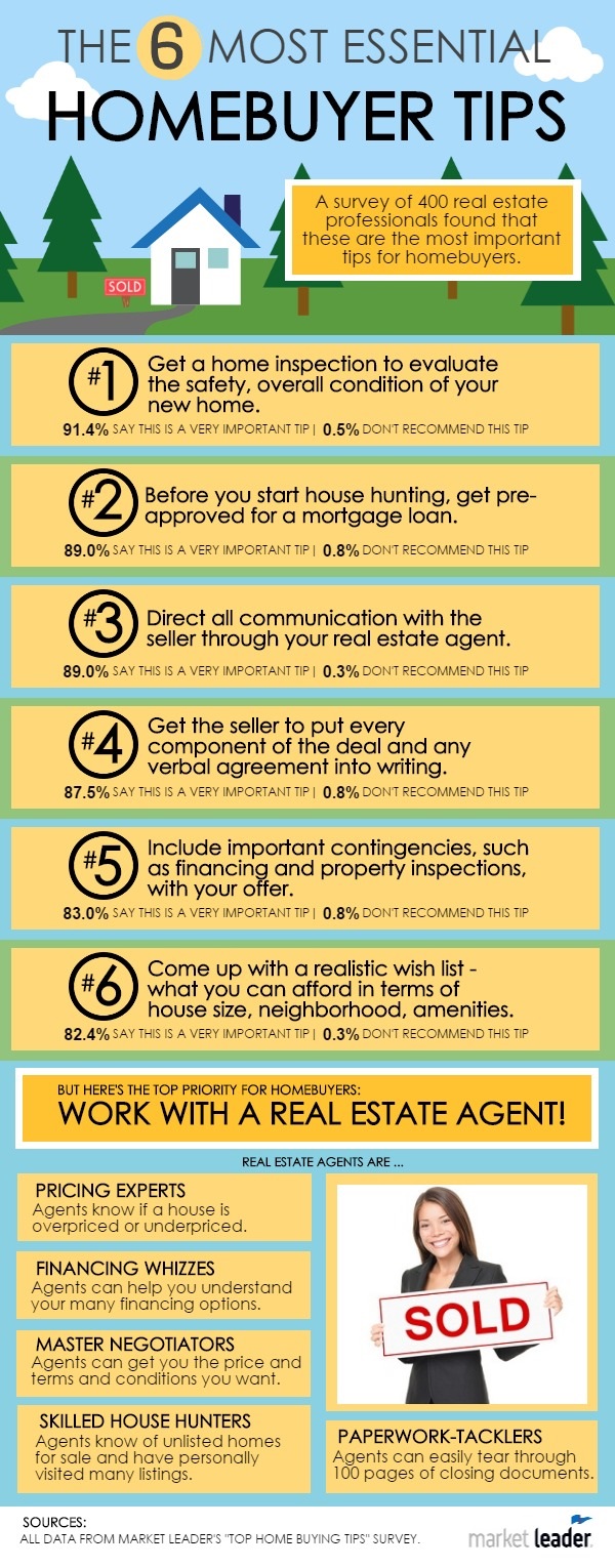 The Market Leader blog staff also created an infographic, “The 6 Most Essential Homebuyer Tips,” that you can share on your website to educate current or prospective clients.